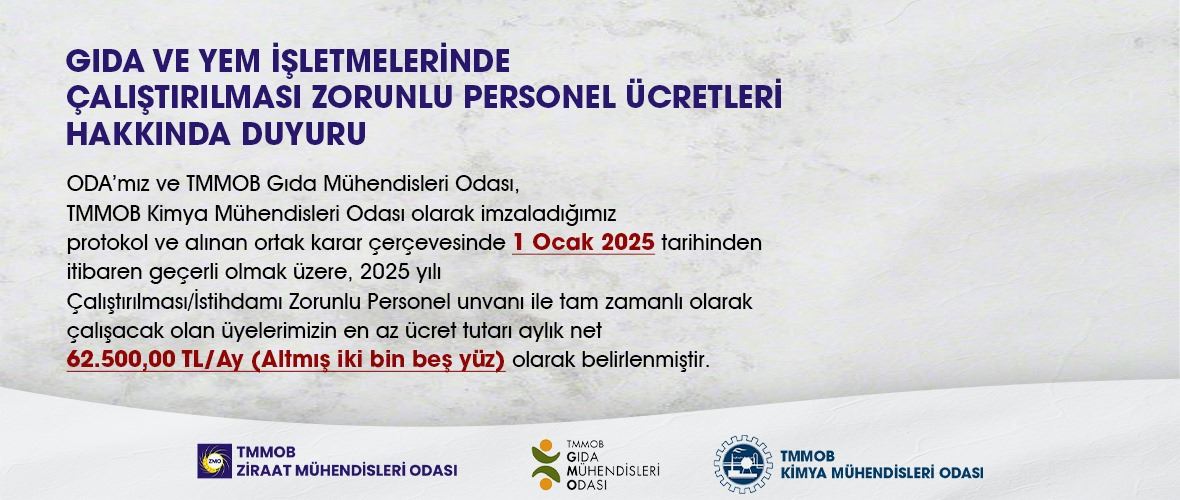 ► 10.01.2025 - TZMO Türkiye Ziraat Mühendisleri Odası, TMMOB Gıda Mühendisleri Odası ve TMMOB Kimya Mühendisleri Odası olarak alınan ortak karar çerçevesinde 1 Ocak 2025 tarihinden itibaren geçerli olmak üzere, 2025 yılı Çalıştırılması/İstihdamı Zorunlu Personel unvanı ile tam zamanlı olarak çalışacak olan ziraat mühendisleri en az ücret tutarı aylık net 62.500,00 TL/Ay (Altmış iki bin beş yüz) olarak belirlenmiştir.